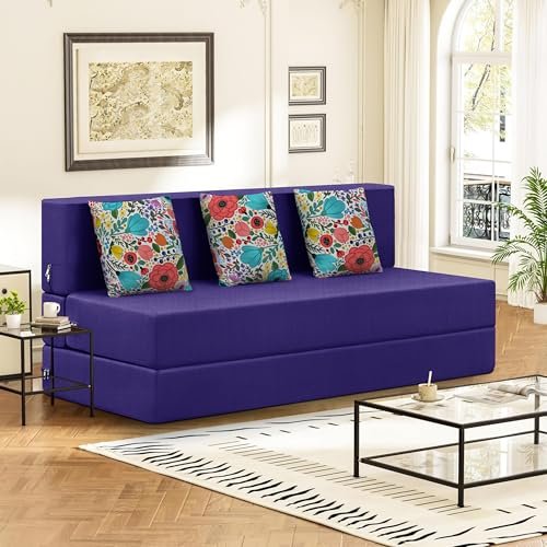 Rosebell Foldable Three Seater Sofa Cum Bed, Sofa Bed 5 X 6 Feet, Jute Fabric- Washable Cover- Including 3 Cushion Perfect for Home & Office for Guests(Purple Color)