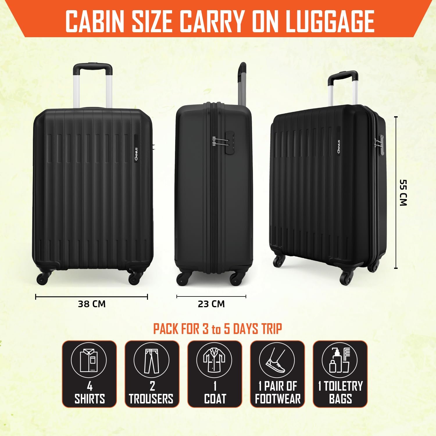 Be the first to review “Safari Cabin Genius Alley 55cm Trolley Bag Hard Case Polypropylene, 4 Spinner Wheels, 360 Degree Wheeling Carry on Luggage, Travel Bag, Suitcase for Travel, Trolley Bags for Travel, Black”