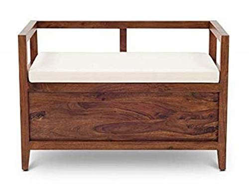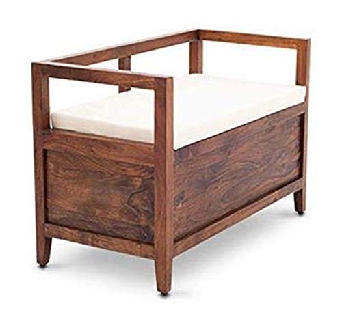 TG Furniture Solid Sheesham Wood Storage Bench with Cushion Seat | Wooden Entryway Bench with Backrest for Hallway, Living Room & Balcony | Multipurpose Seating Benches with Storage Box | Natural