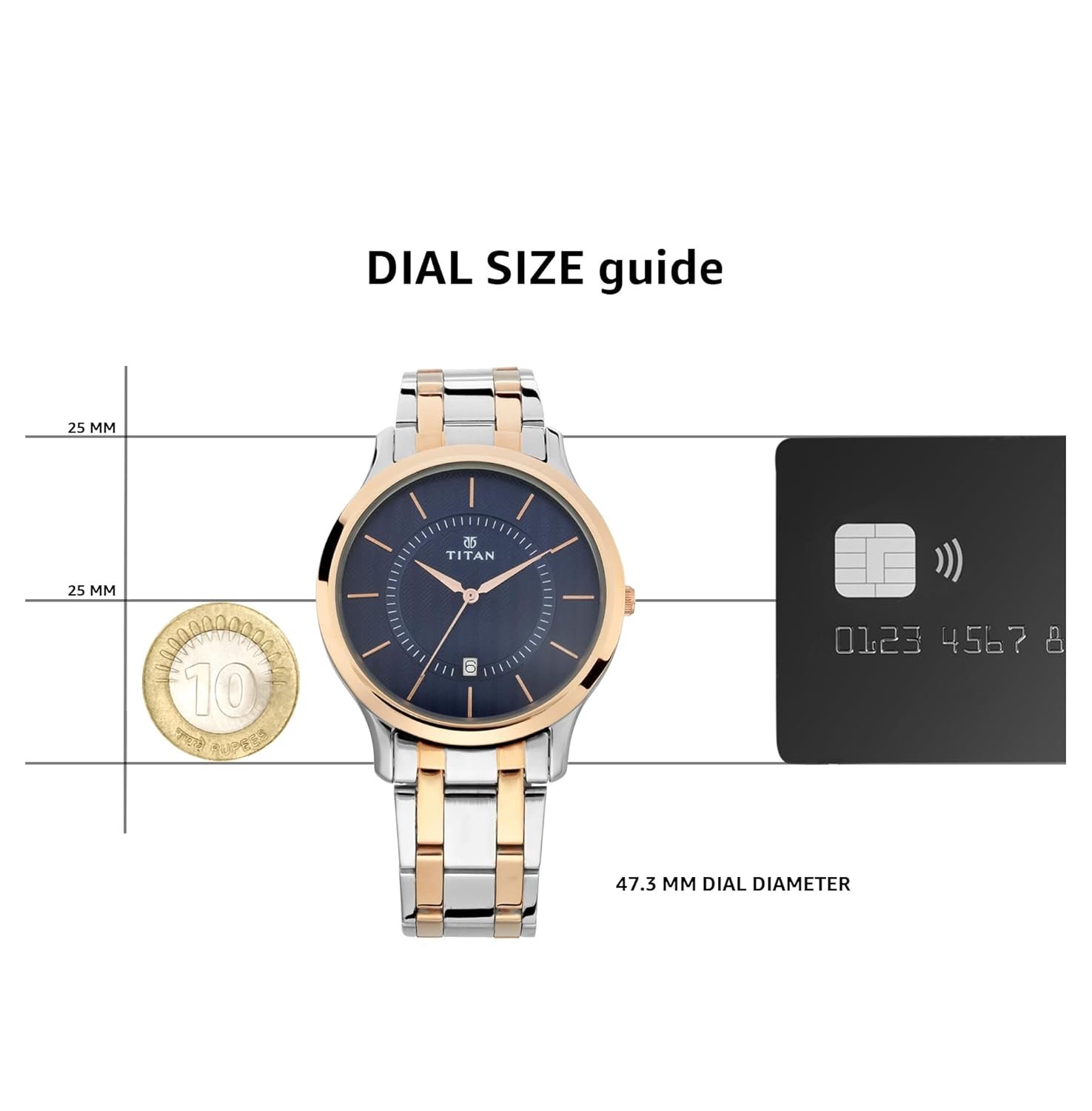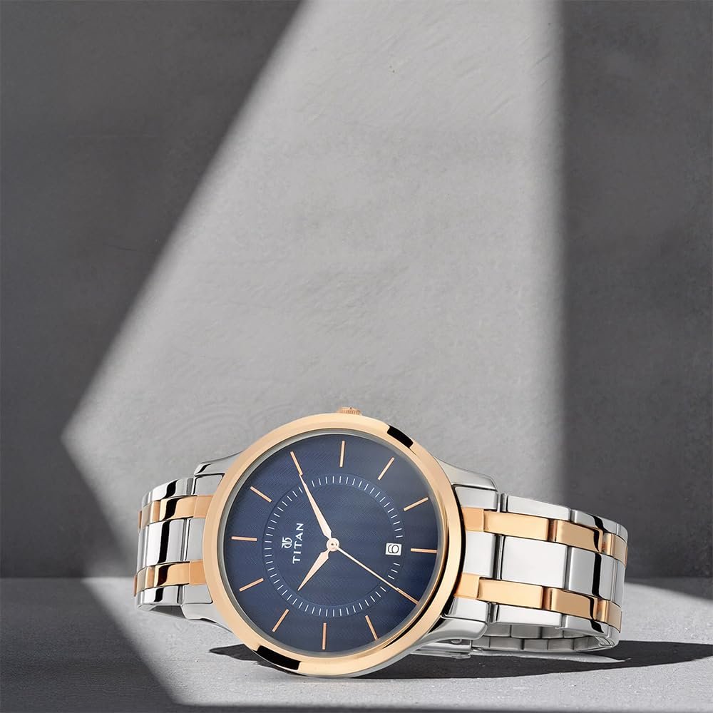 Titan Karishma Quartz Analog With Date Blue Dial Two Toned Silver & Rose Gold Stainless Steel Strap Watch for Men – NT1825KM01