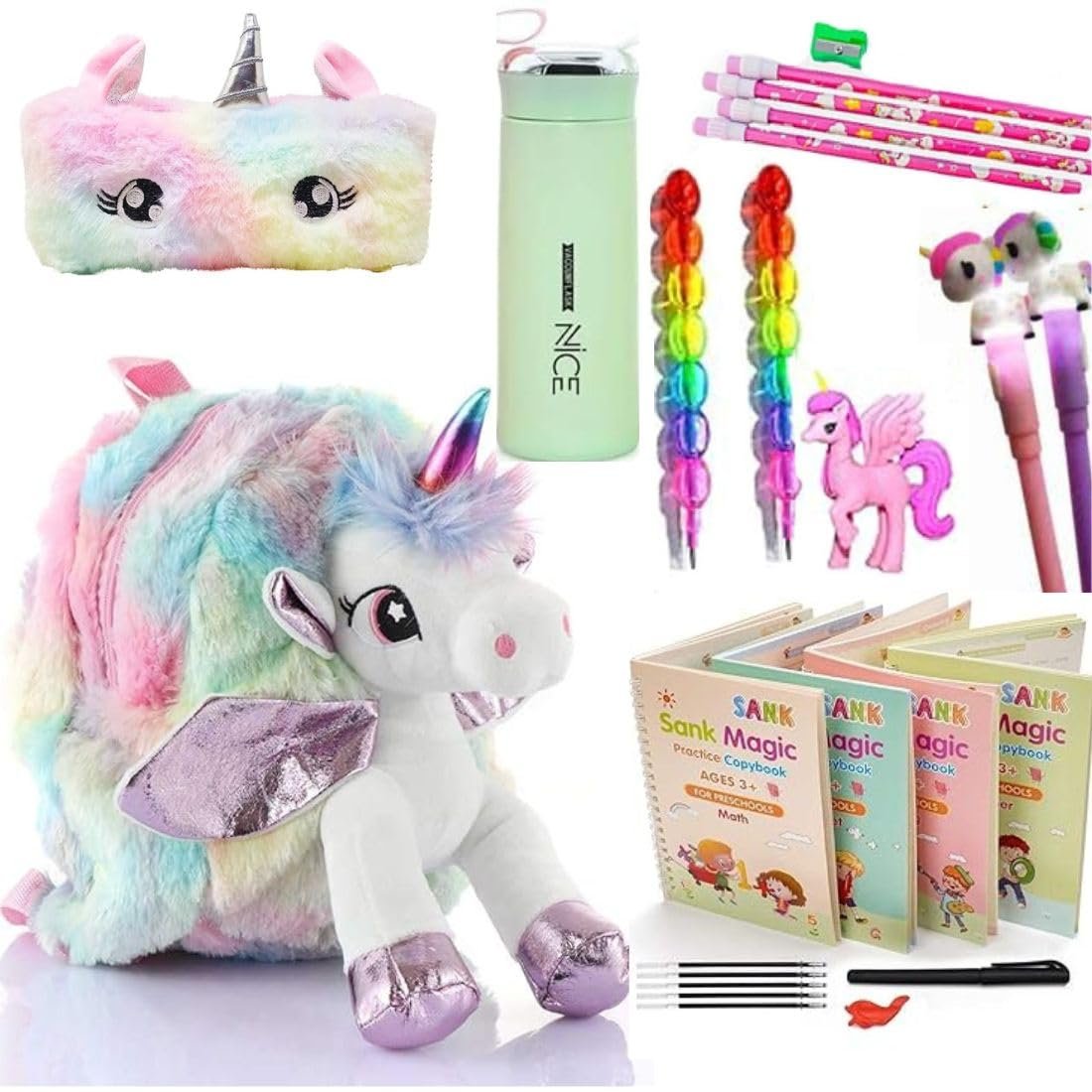 Unicorn School Supply Set for Kids, 15 Pieces with Plush Toy, Pencil Case, Water Bottle, Stationery and Practice Books, Ages 3+