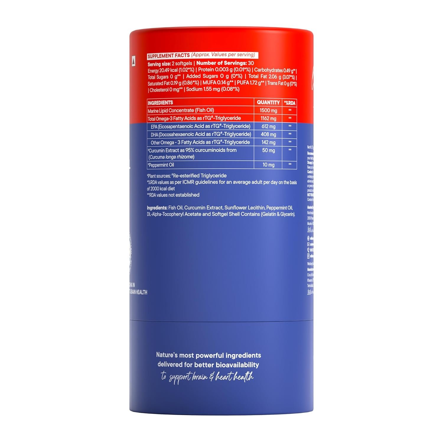 Wellbeing Nutrition Slow 3x Strength Omega 3 Fish Oil Capsules | 1500mg with EPA 612mg, DHA 408mg & Curcumin for Men & Women | No Fishy Burp | For Brain, Heart, & Joint Health, 60 Softgels